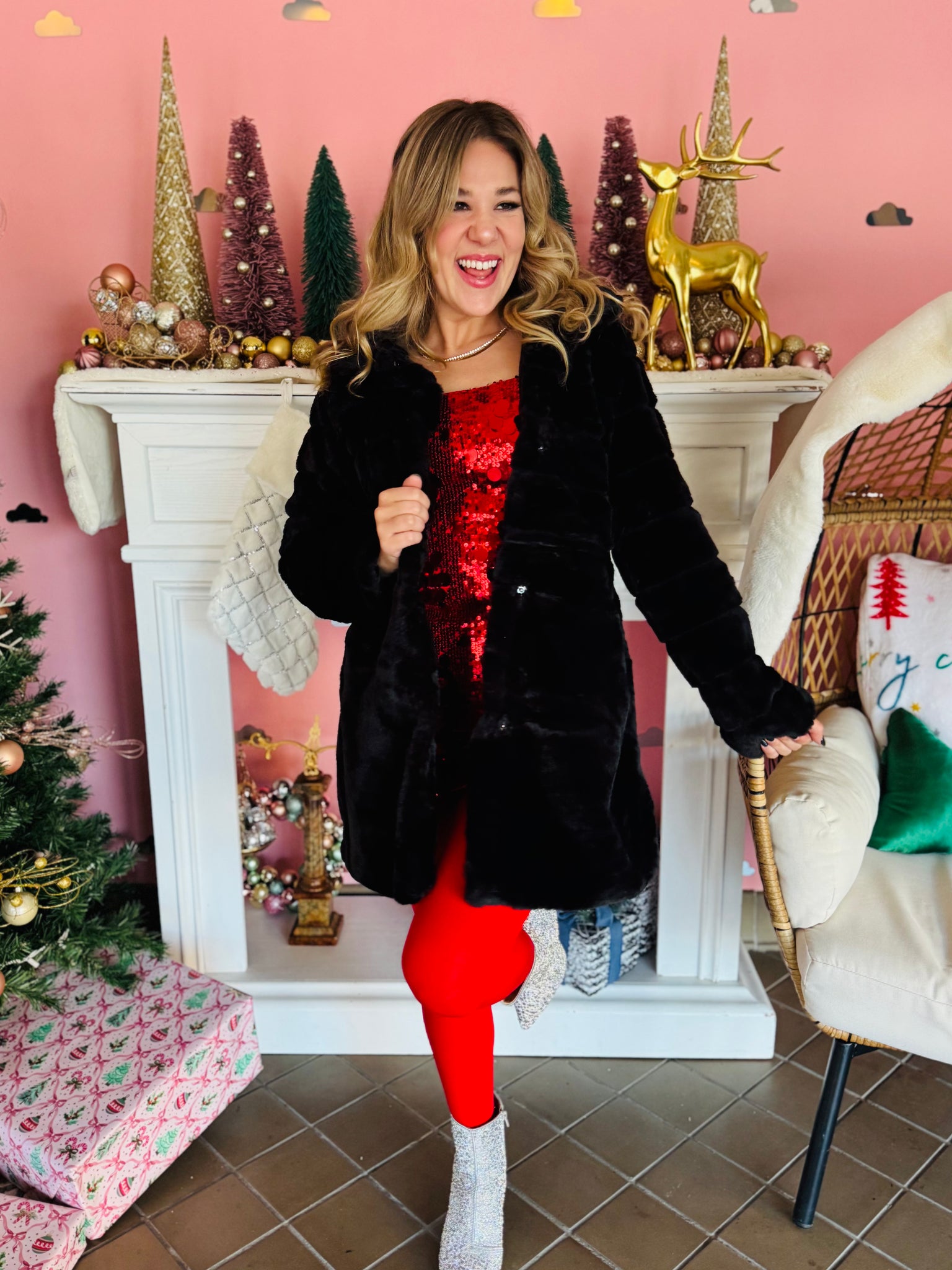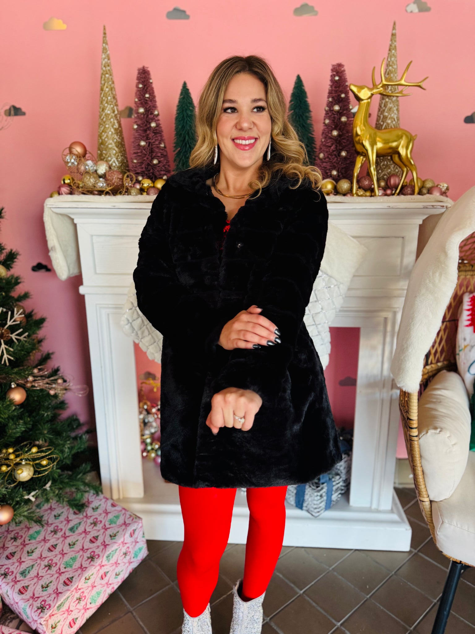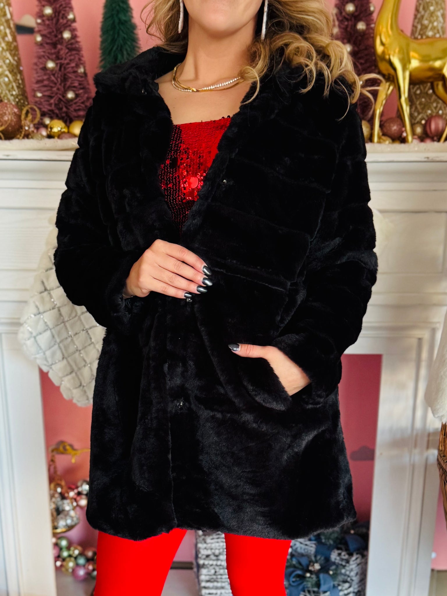 The most fabulous black  faux fur coat to wear this winter season! It is a longer style with pockets. It has a collar and front snap buttons. Coat runs true to size and is the softest coat you will own!