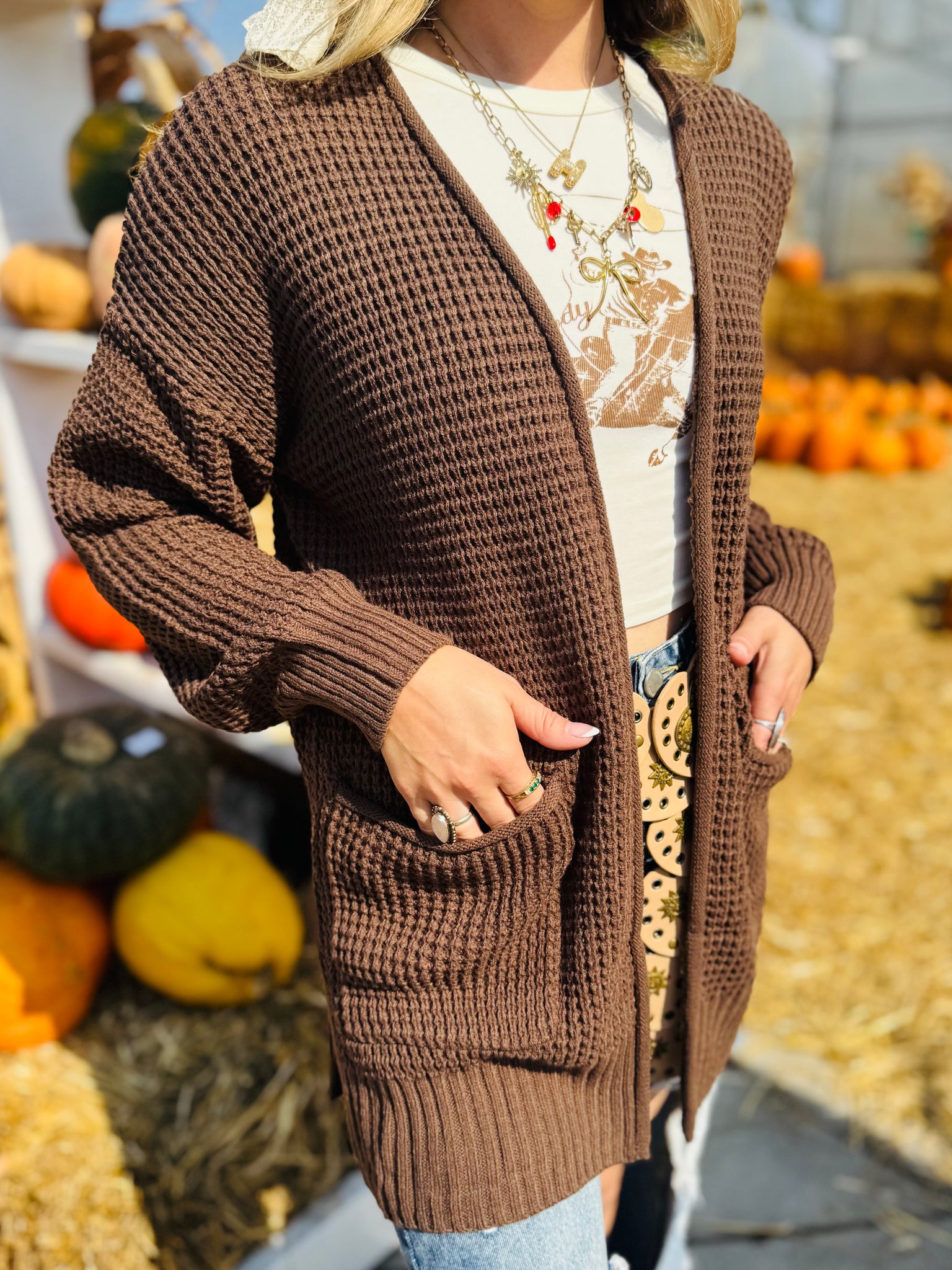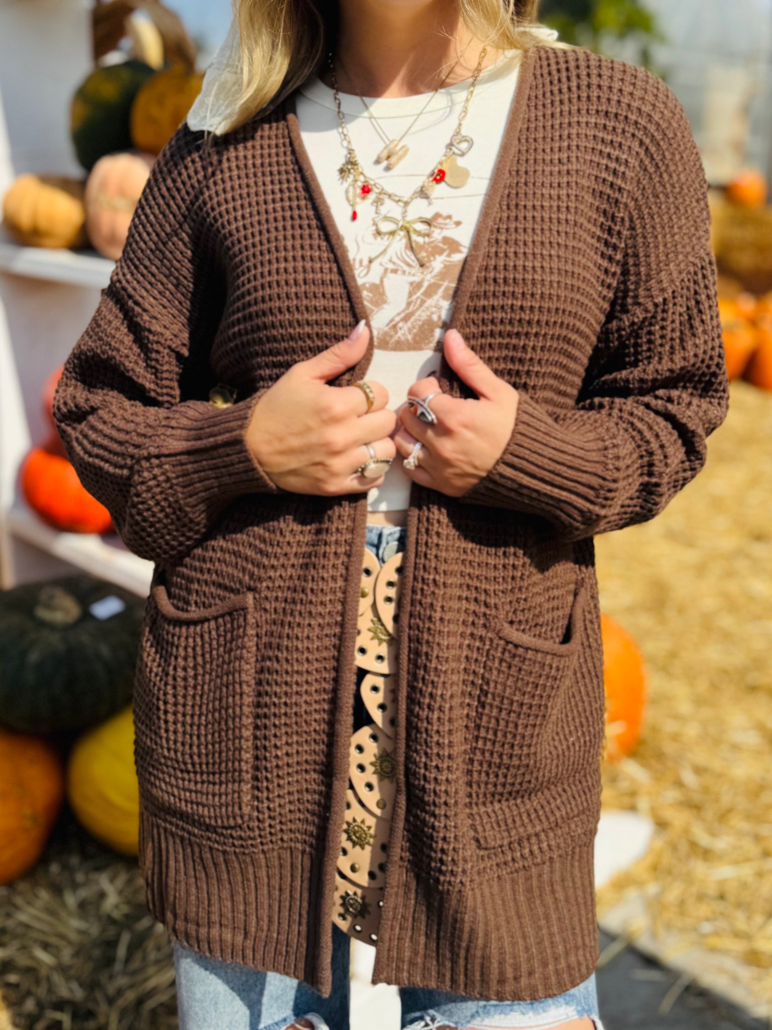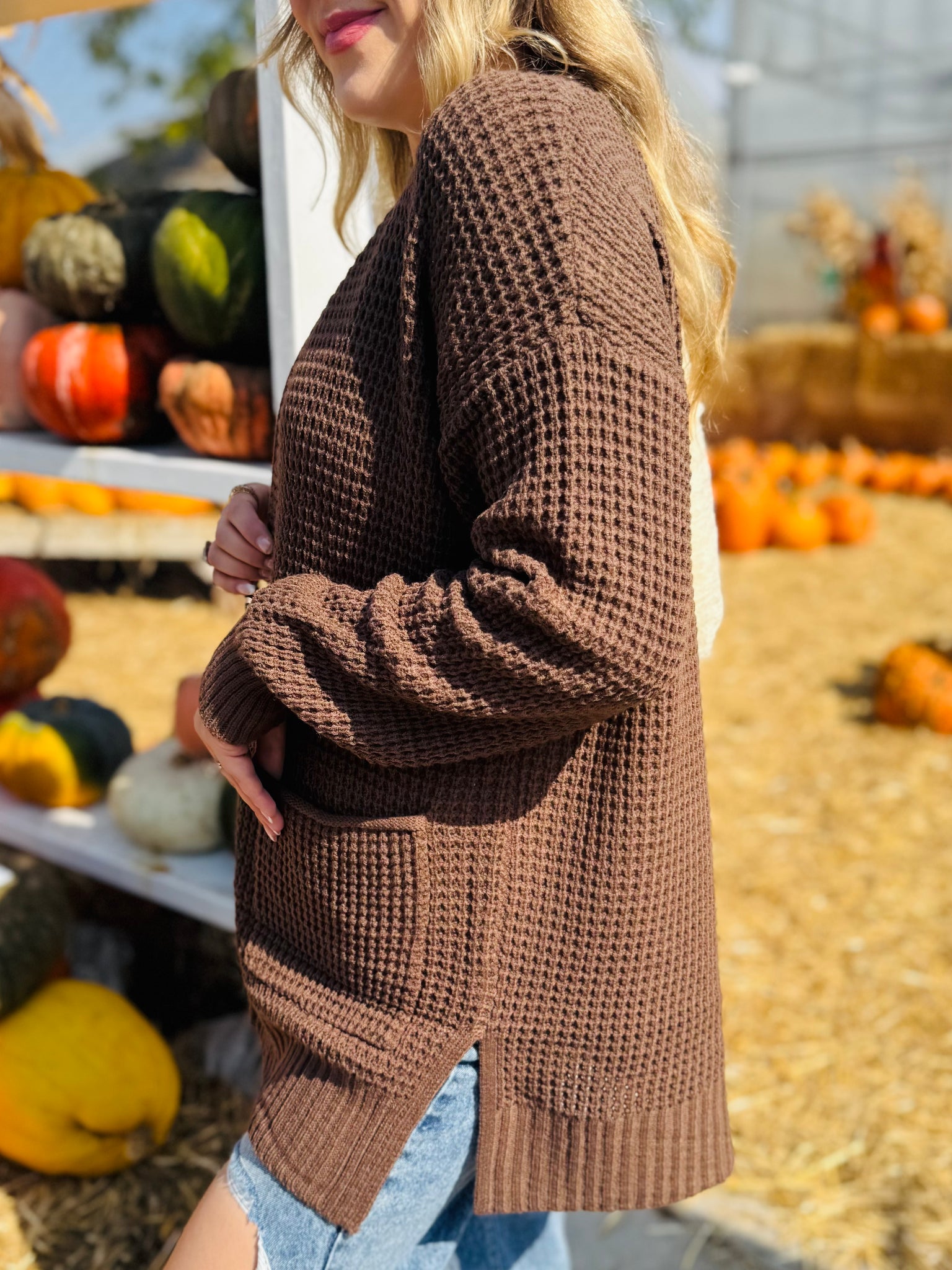 We love a good comfortable cardigan! Especially when it's this beautiful chocolate brown color. This cardigan is a waffle knit and has front pockets. Runs slightly oversized.