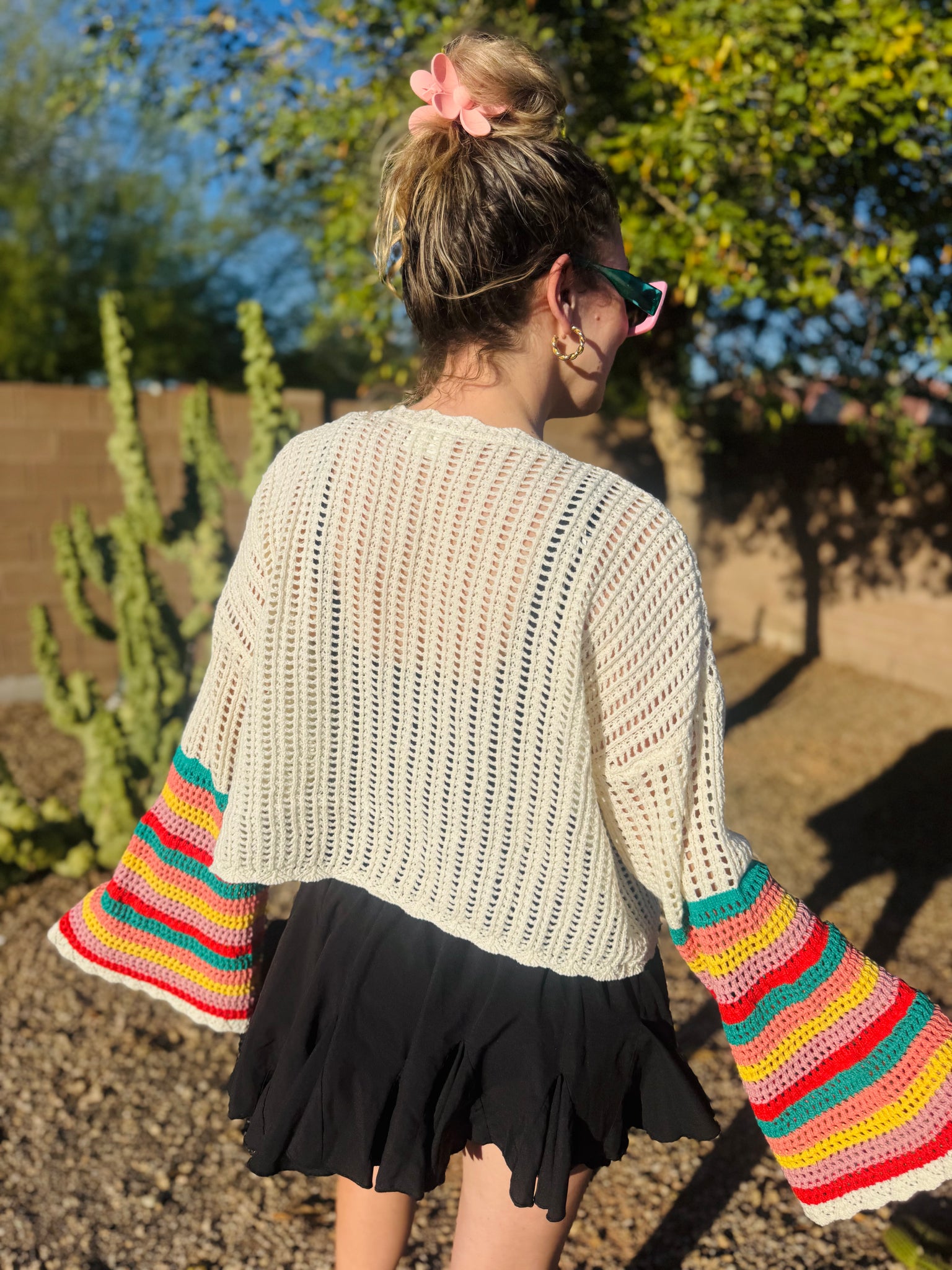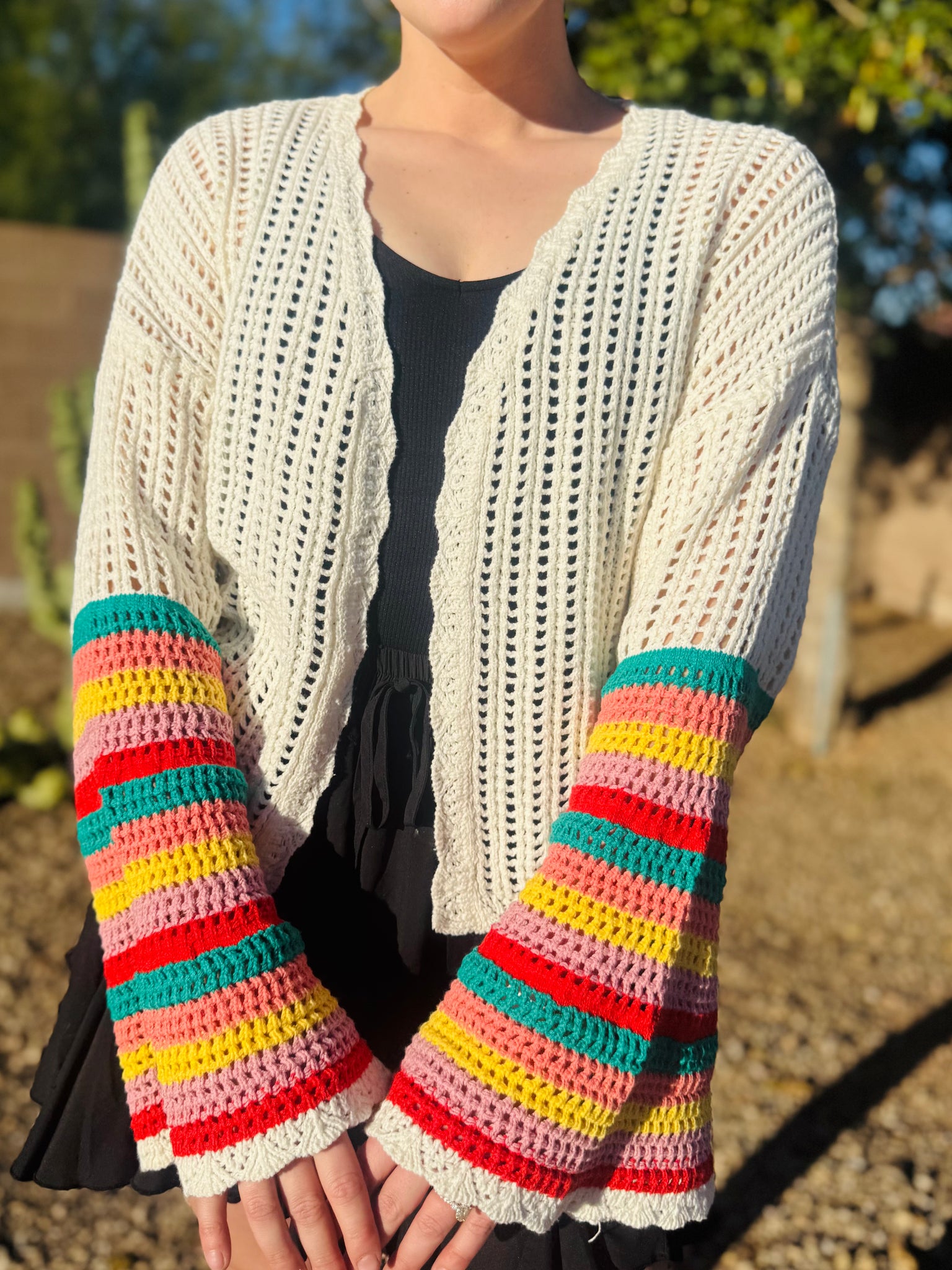 Obsessing over this new crochet cardigan! It has colorful bell sleeves and an open front. Cardigan can be easily paired with any tank or t-shirt underneath. Runs slightly oversized.