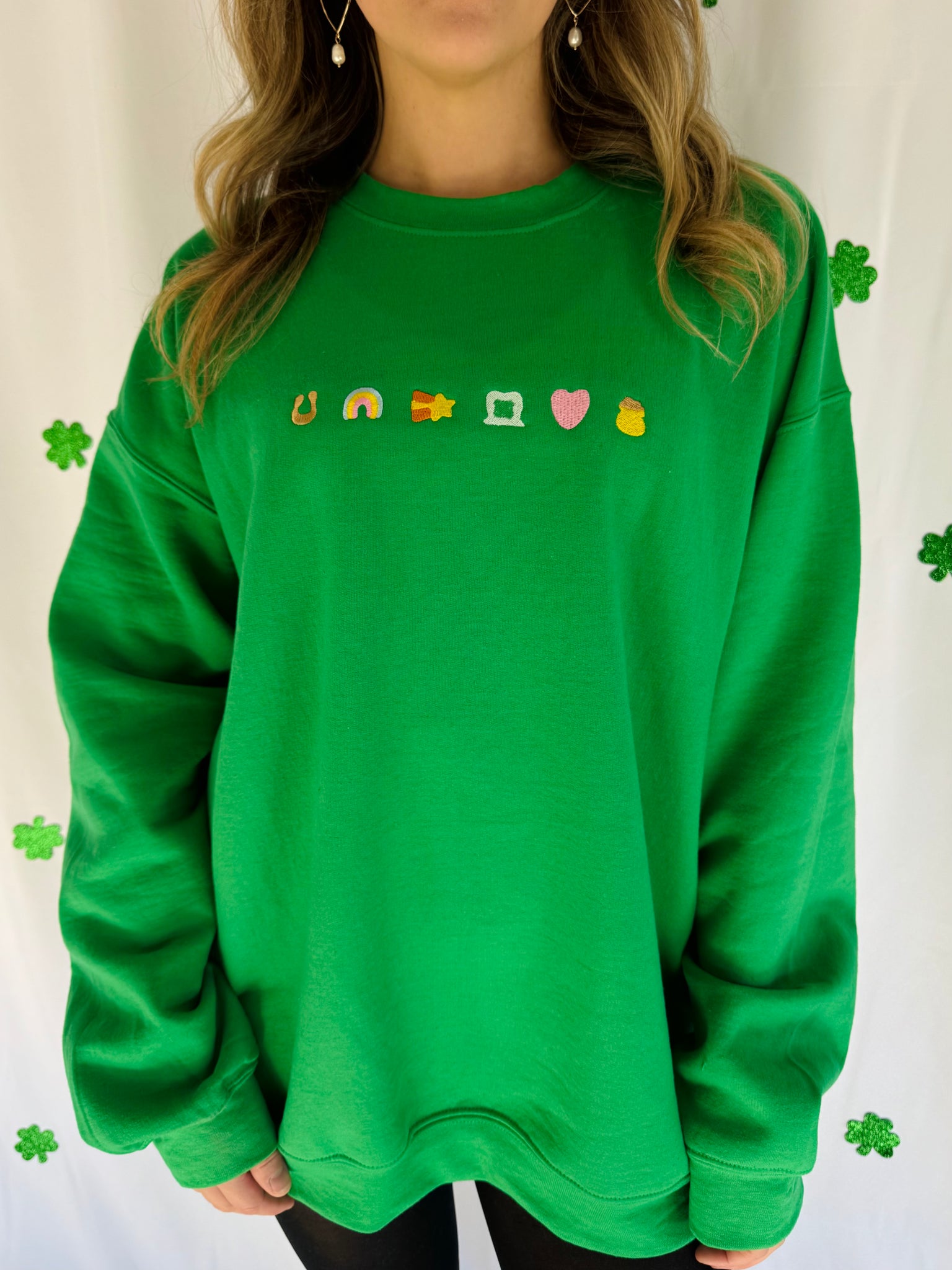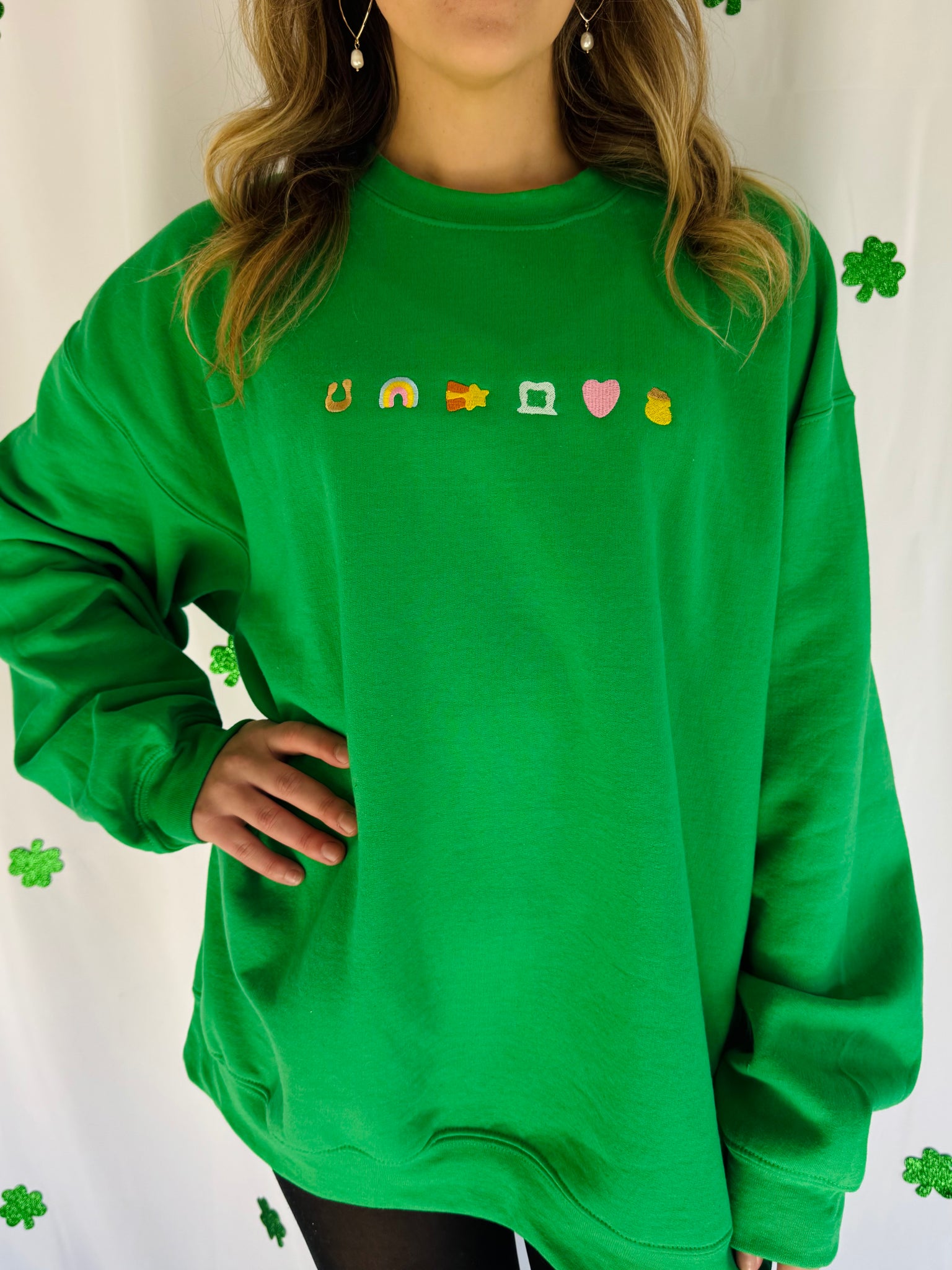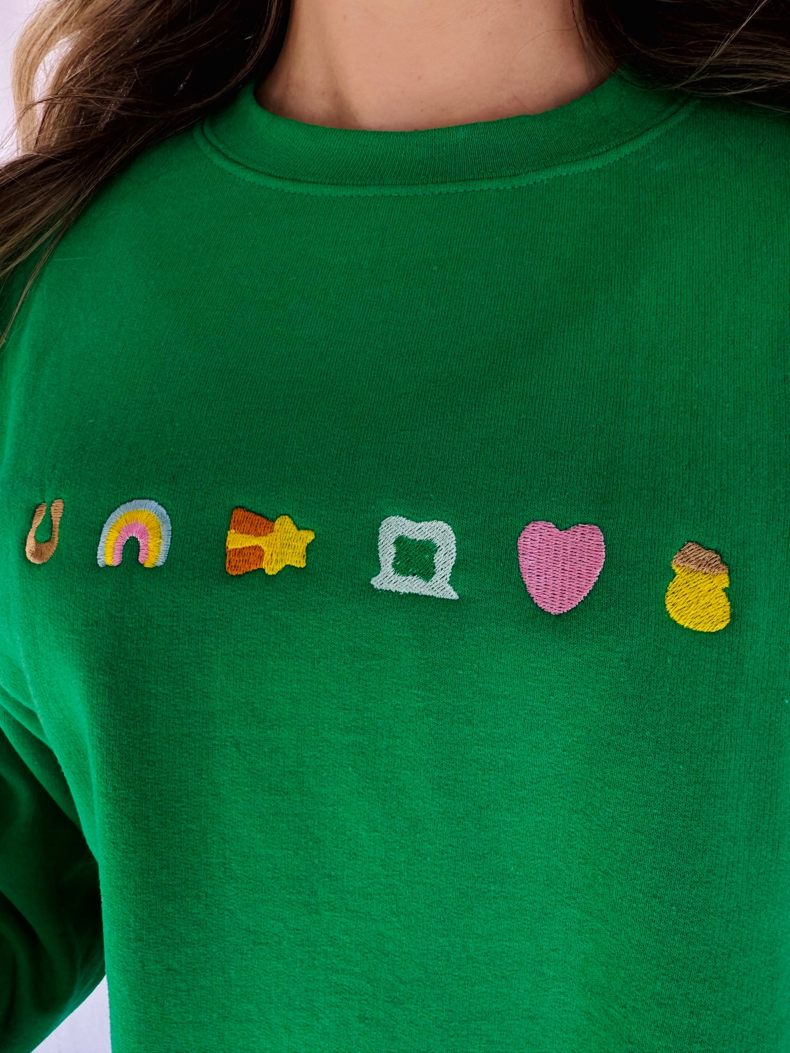 The cutest embroidered crewneck! This green crewneck sweatshirt has the most adorable lucky charm marshmallows embroidered on the front and runs slightly oversized.
