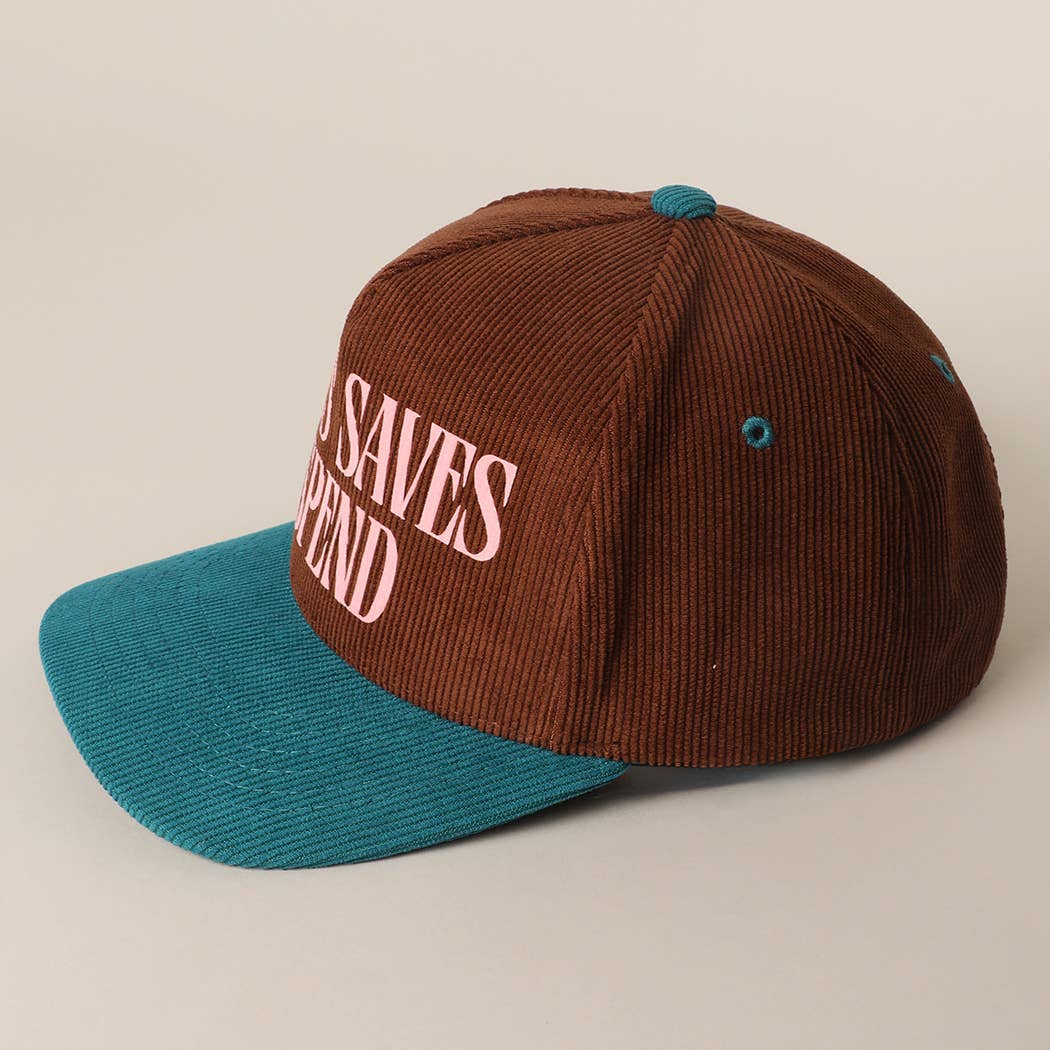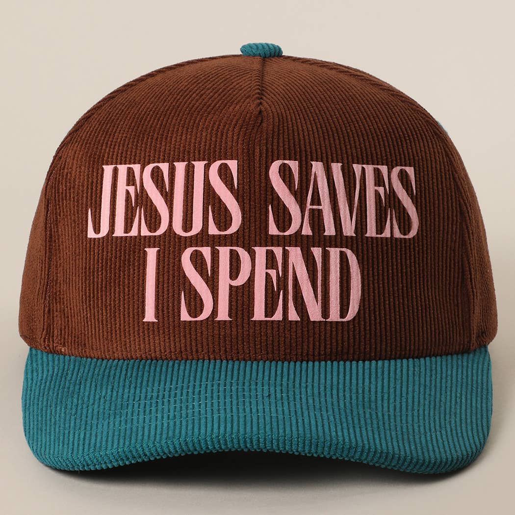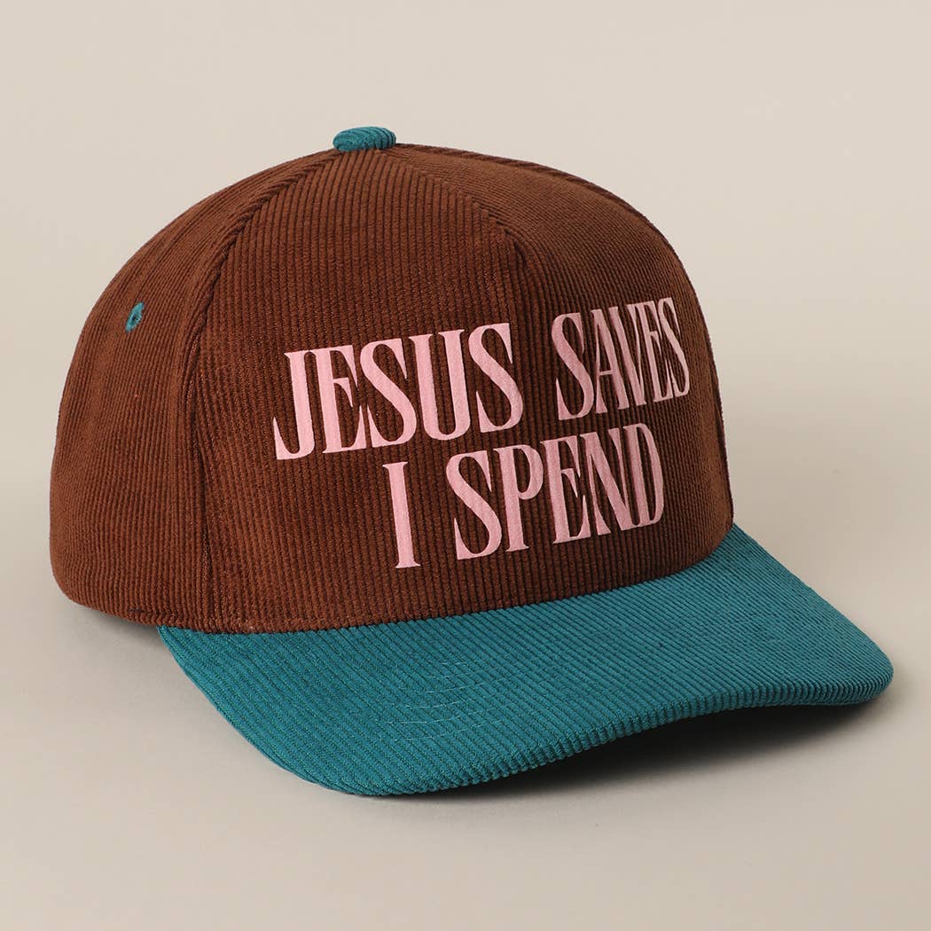 The most fun corduroy trucker hat that reads “Jesus Saves I Spend”. The colors and corduroy material give it that vintage feel. 20% Cotton 80% Polyester. One size fits most: Adjustable snapback closure.