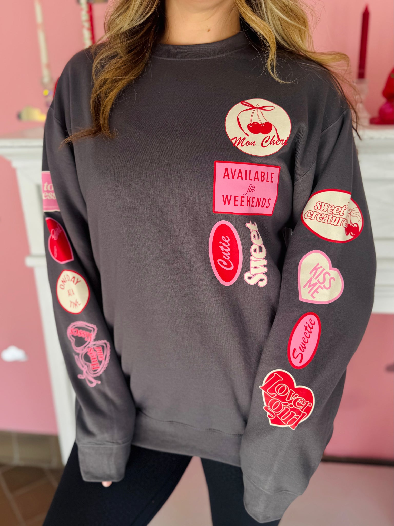 Sending all the positive vibes your way with this adorable love patch crewneck! This dark grey crewneck has fun printed patches down both sleeves and on the front side of the sweatshirt. Perfect for Valentine’s Day & every other day of the year. Runs slightly oversized.
