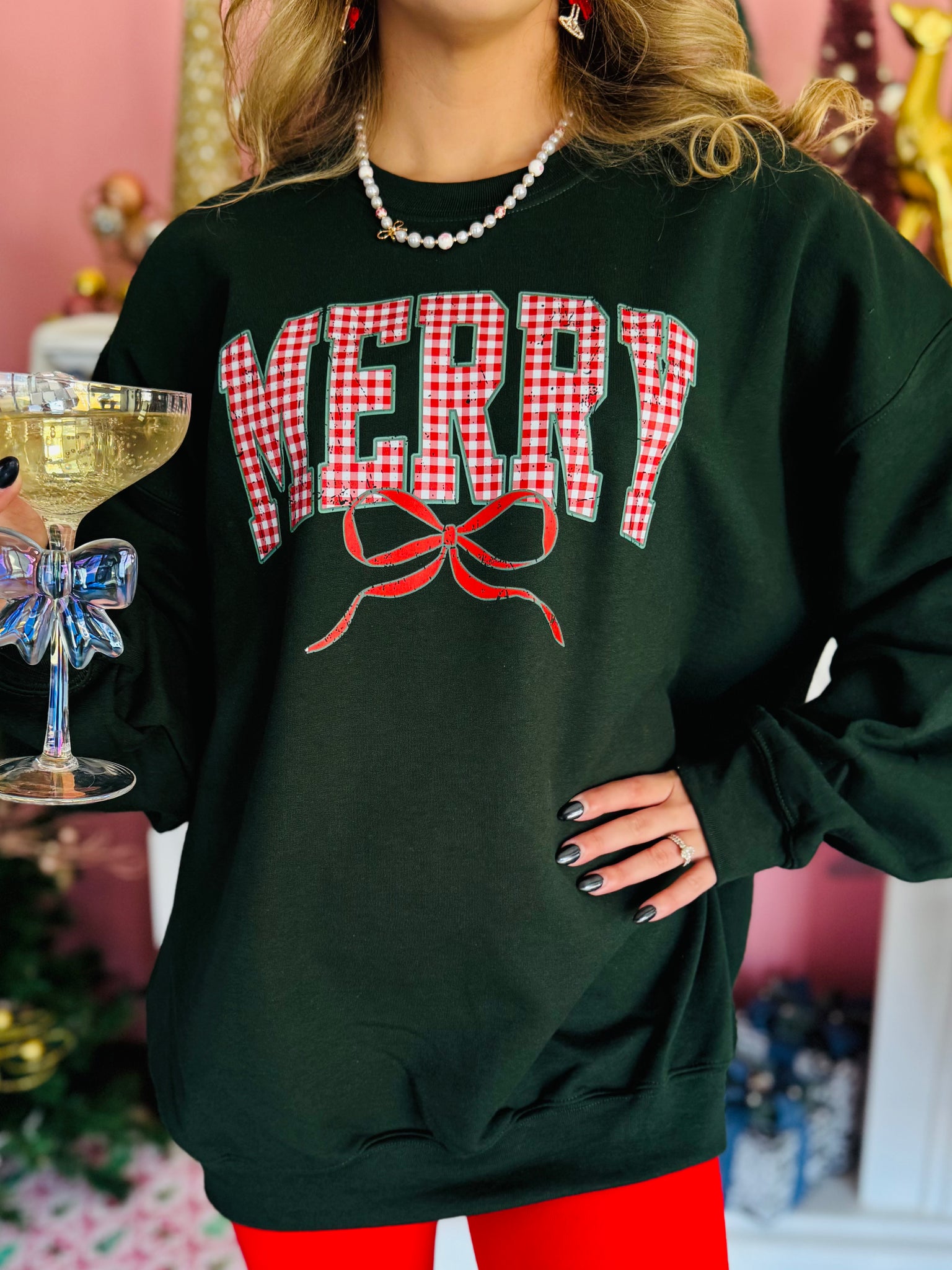 This adorable forest green crewneck is the coziest and reads "Merry" in a red gingham print. The bow at the bottom is the perfect touch and it has a vintage look to it. Crewneck runs slightly oversized.