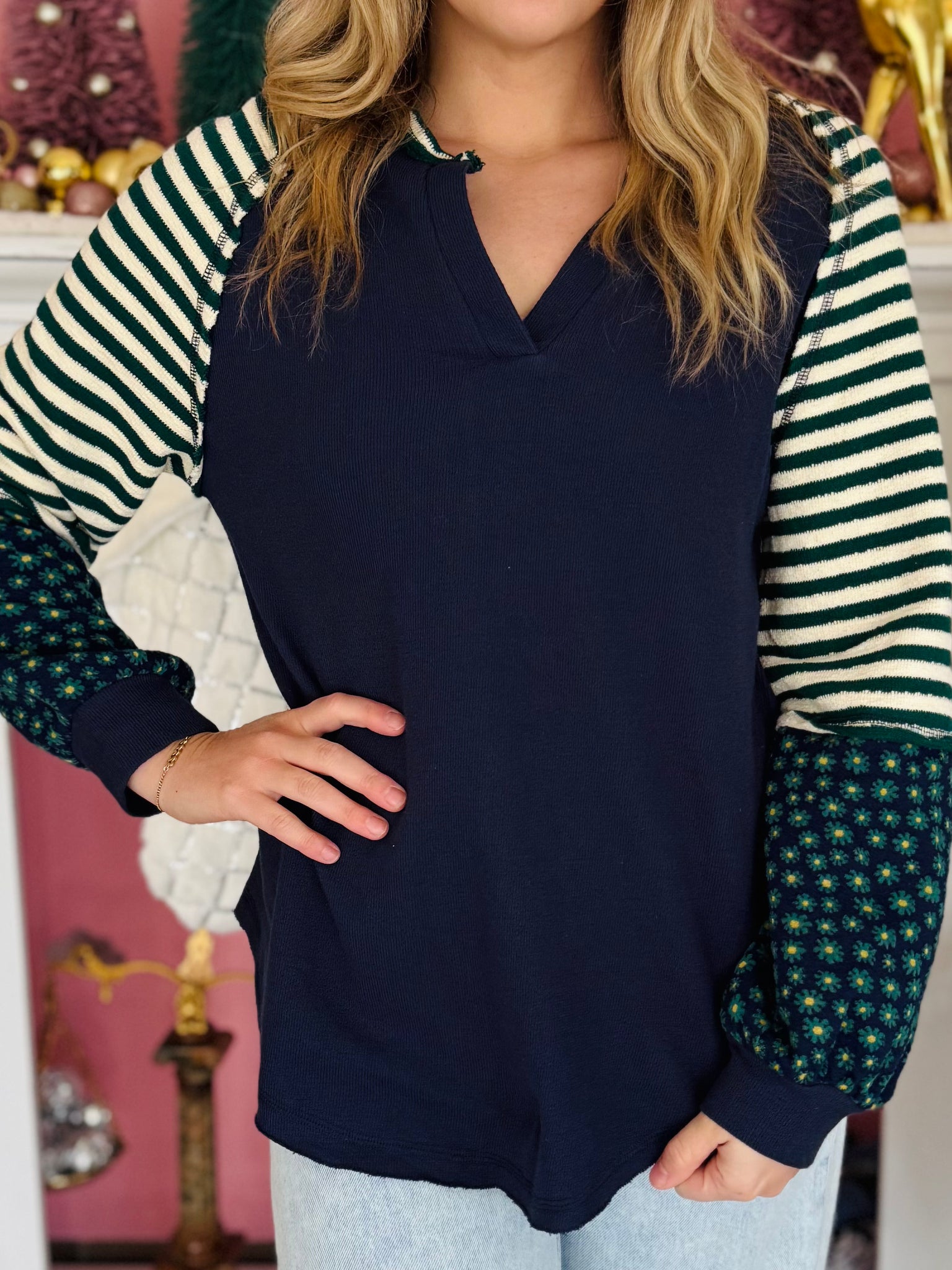 The cutest navy blue long sleeve top! This top has stripe & floral print sleeves. An adorable casual top to go into spring with. Top runs oversized.