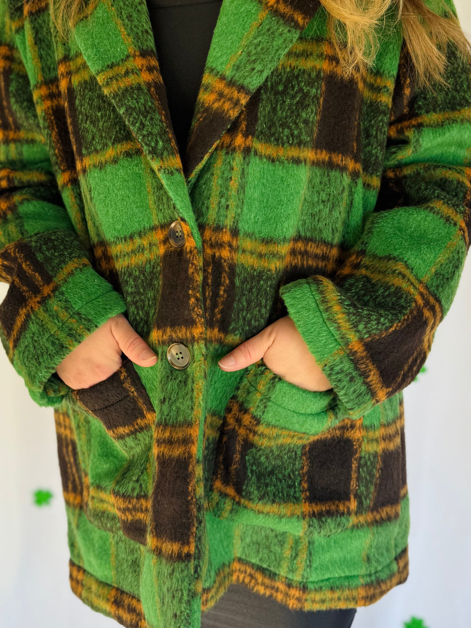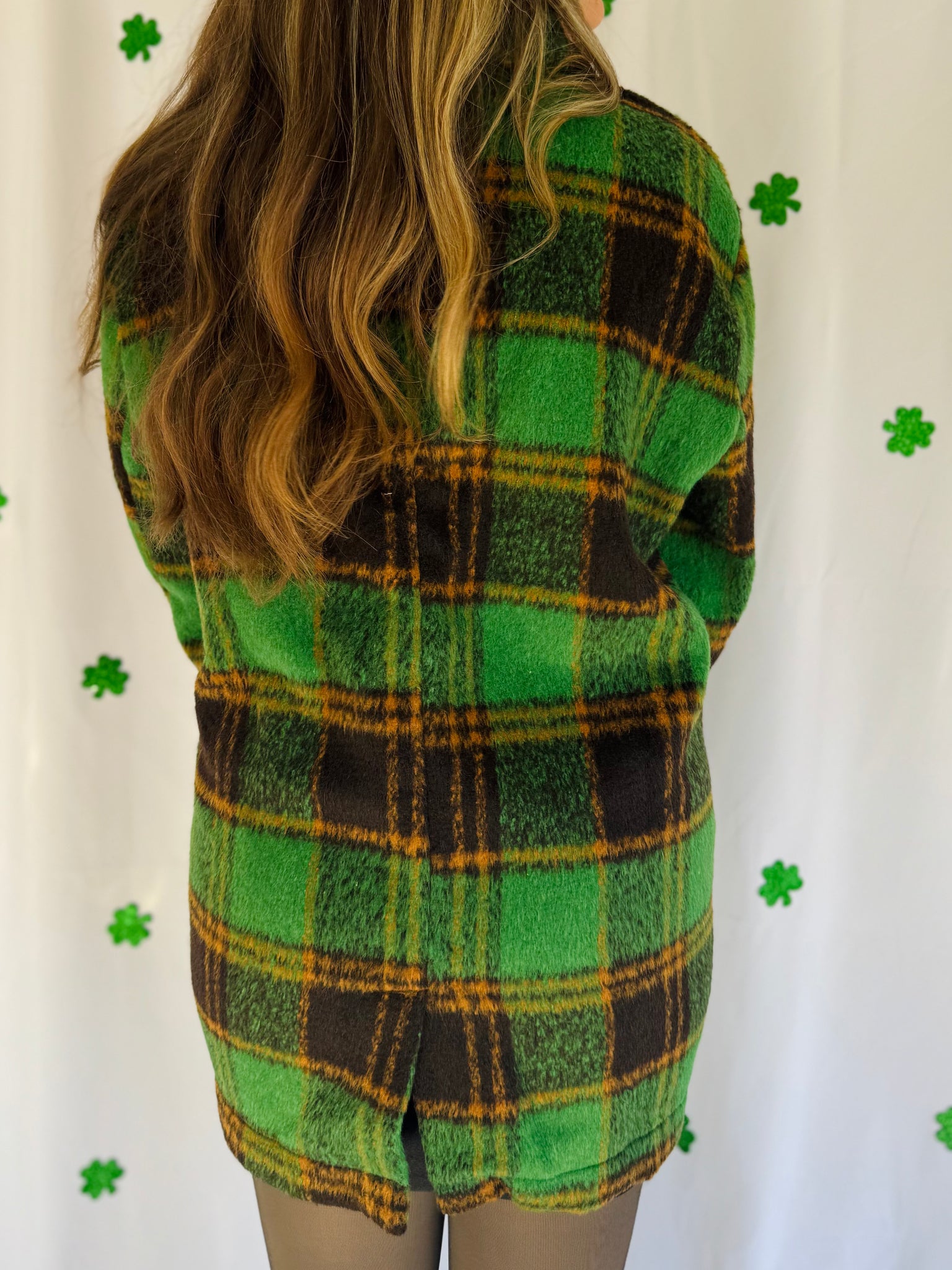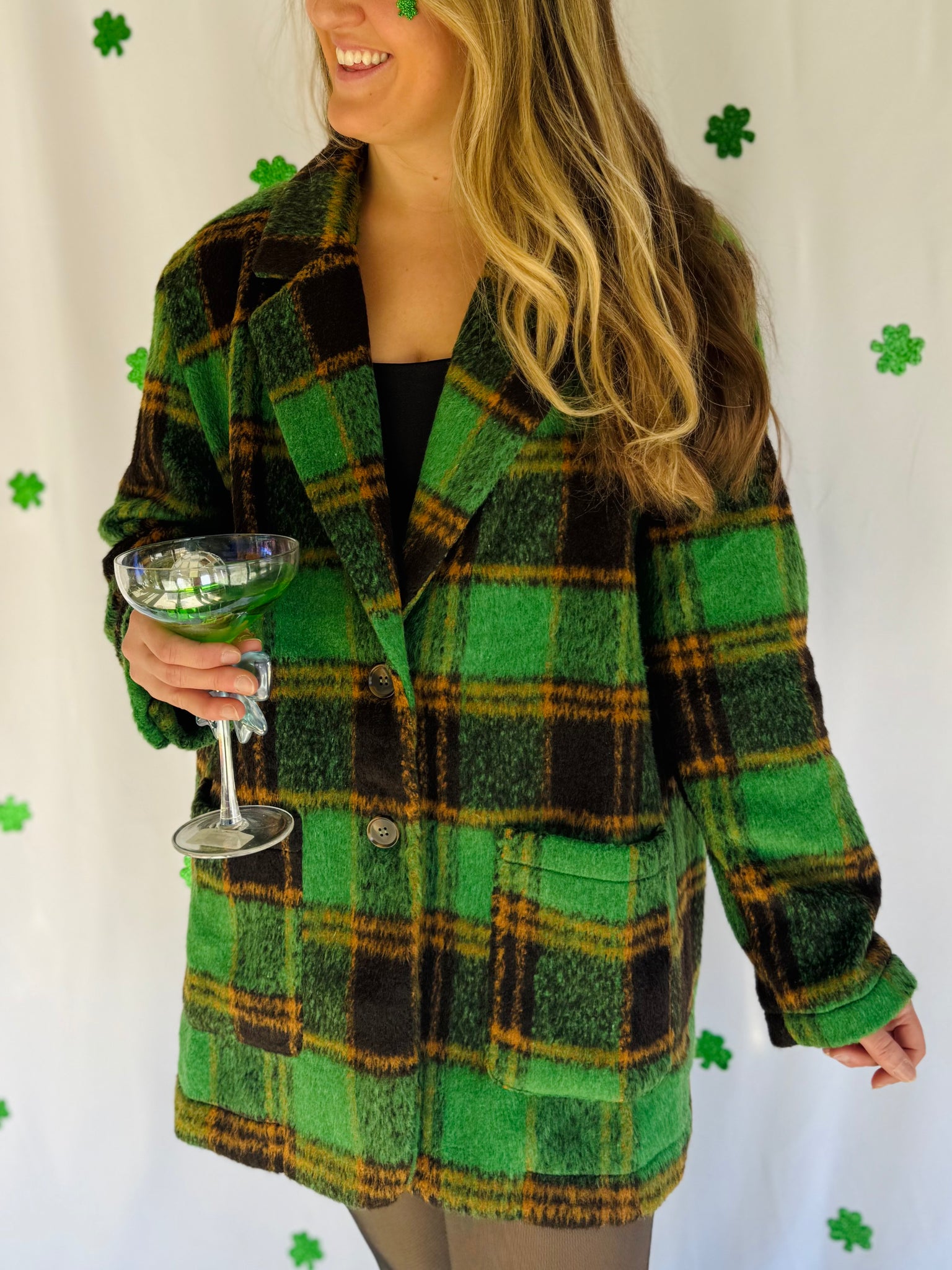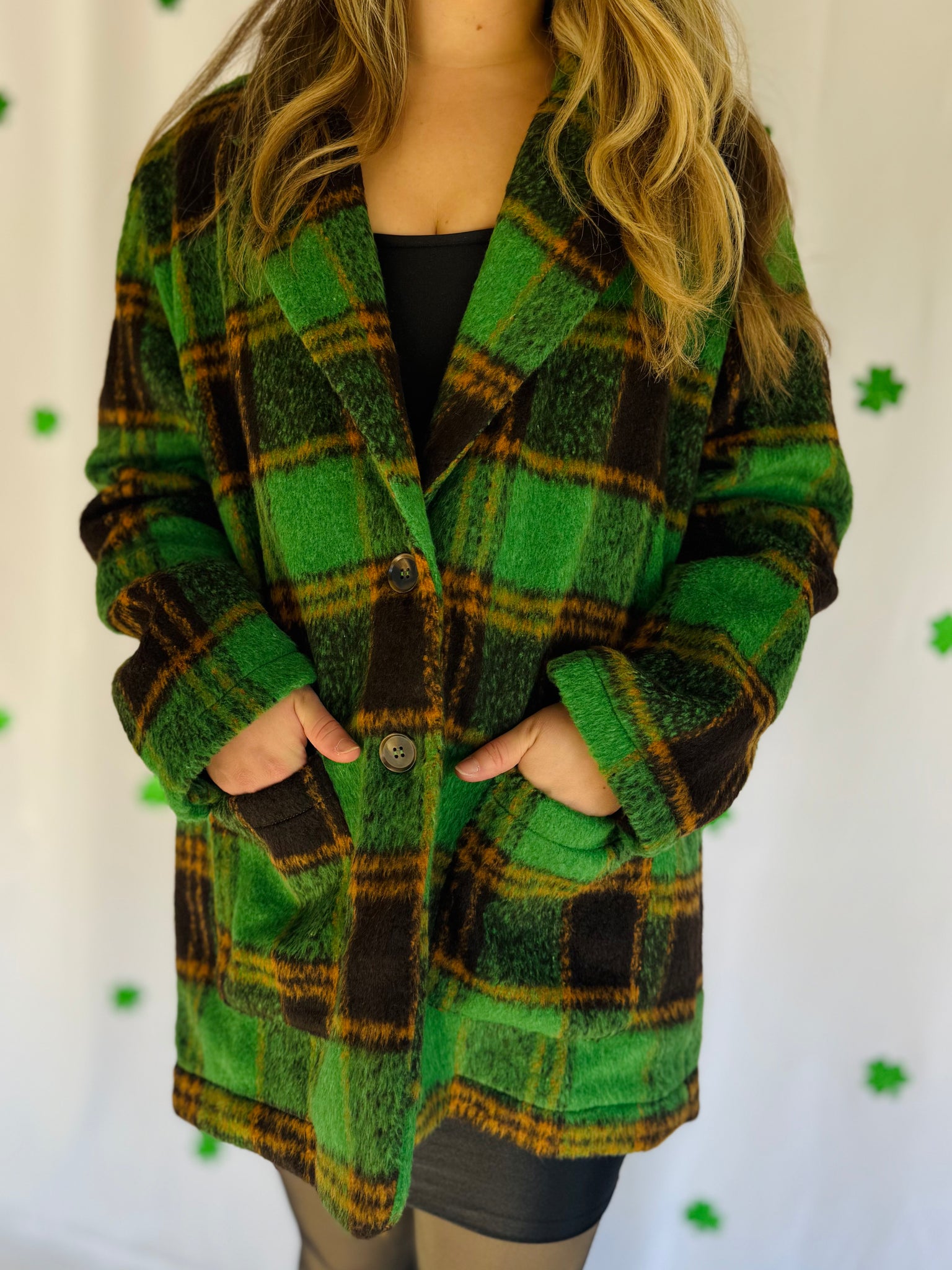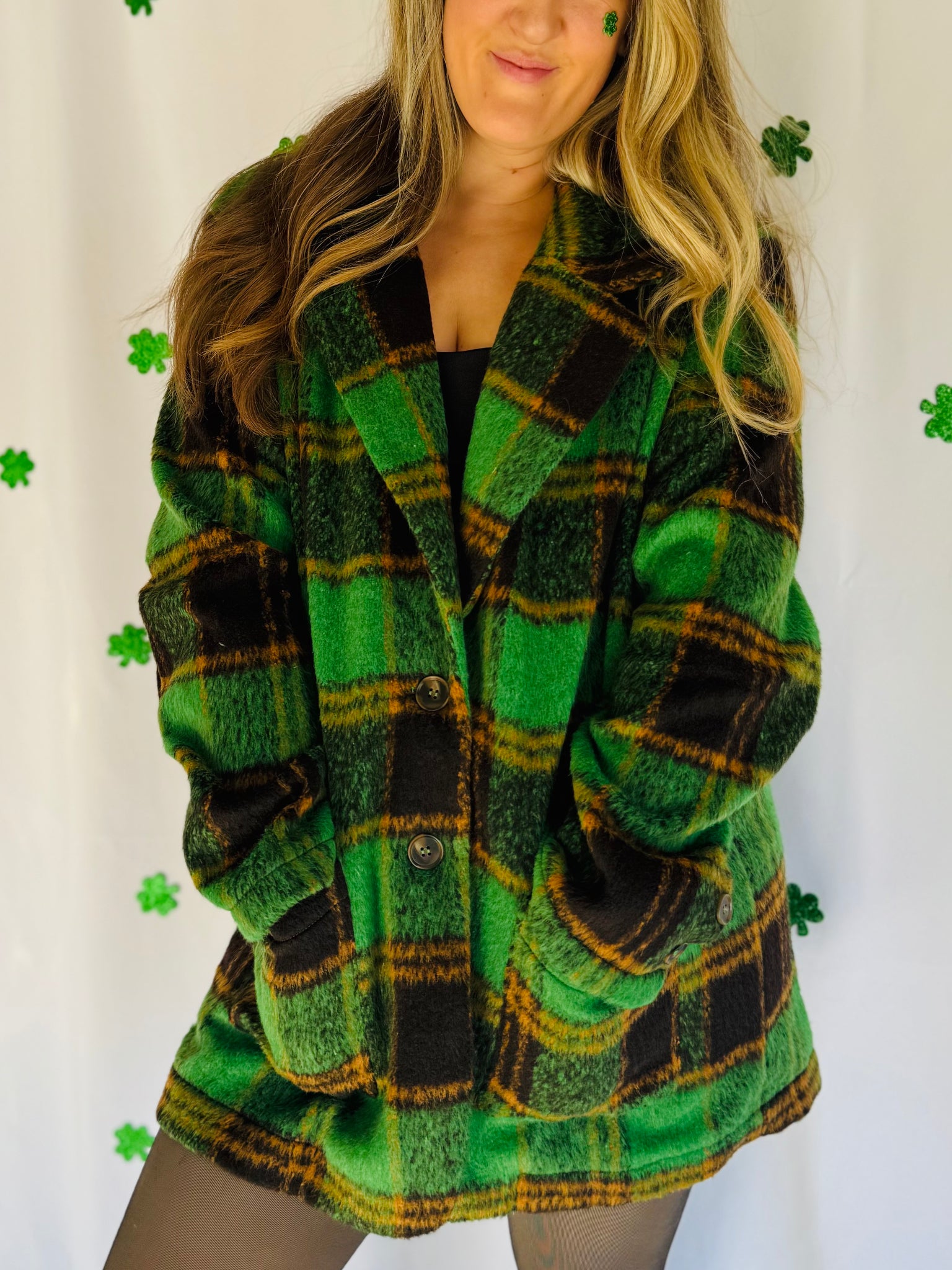 Obsessed with this plus size green plaid jacket! It has a collar with a front button closure and pockets. It’s such a cute elevated look for St. Patty’s Day! Runs true to size.