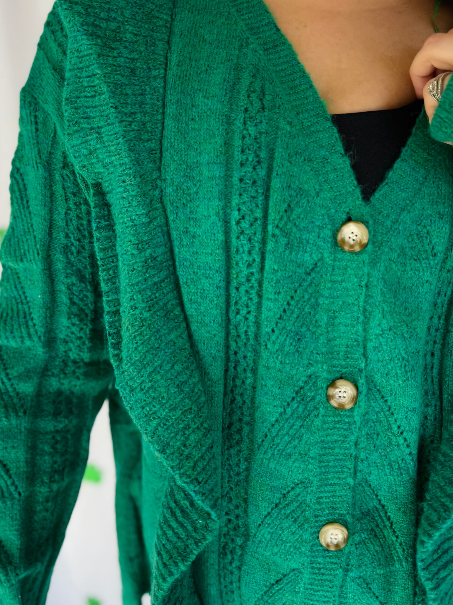 The coziest green plus size cardigan! This stretchy cardigan has a v-neck cut with a front button closure. It has adorable ruffle detailing on the front and can easily be paired with any undershirt. Cardigan runs slightly oversized.