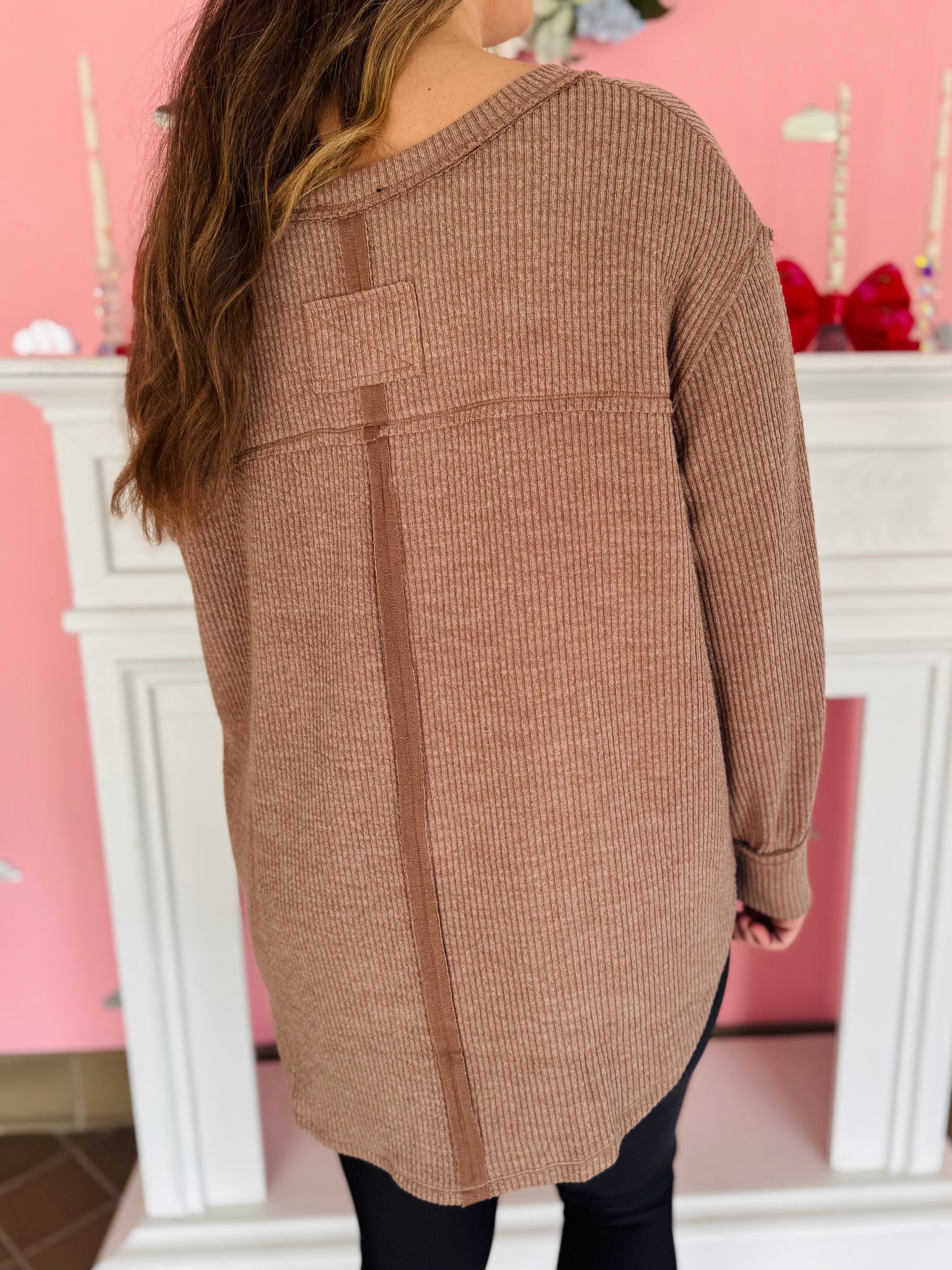 The comfiest casual plus size top! This long sleeve top is a soft ribbed material and has stretch to it. It has an asymmetrical cut with an exposed hem. Top runs true to size.