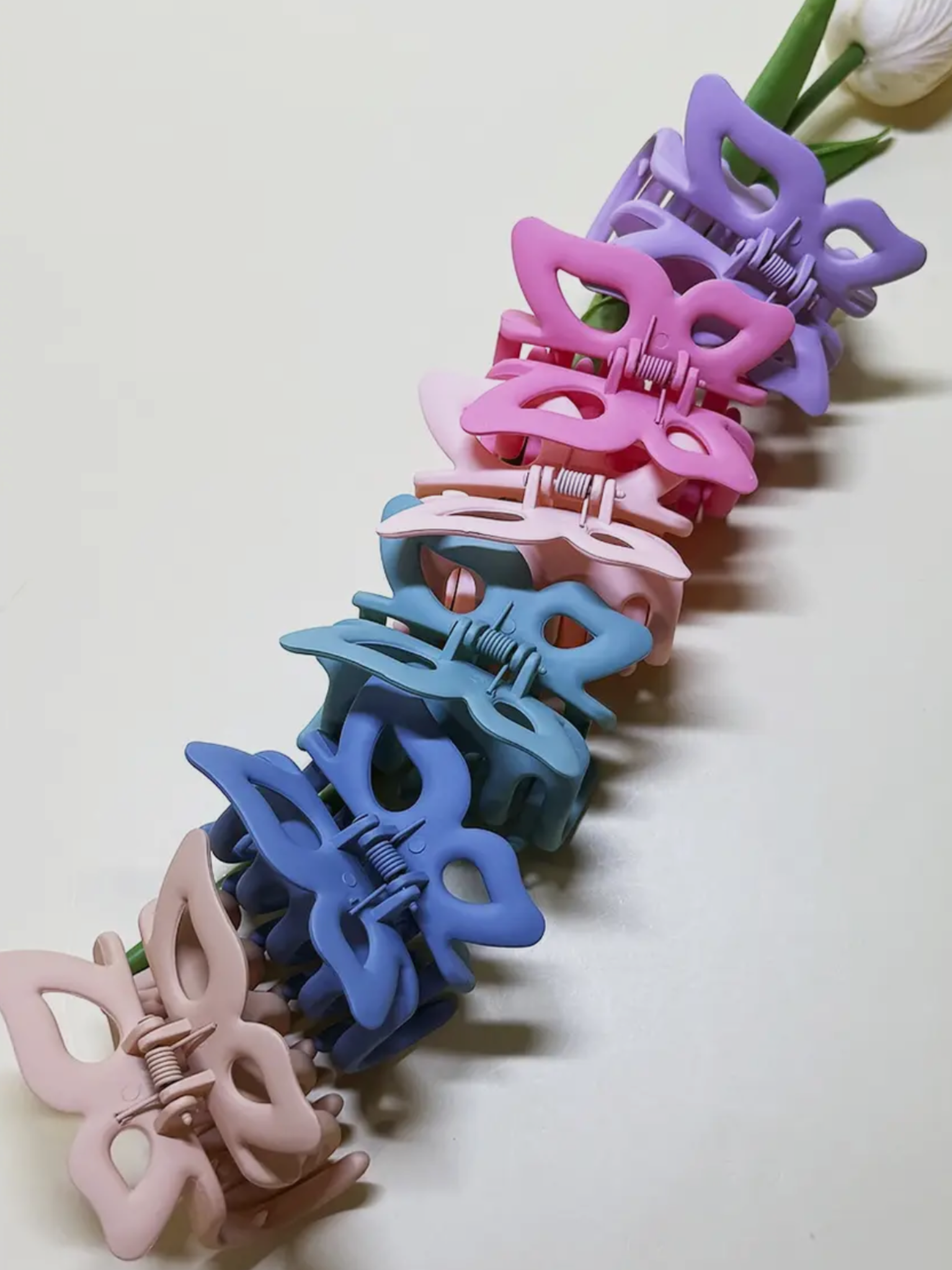The cutest new butterfly hair claws! These colorful butterfly shaped claw clips come in 6 different color options to choose from.