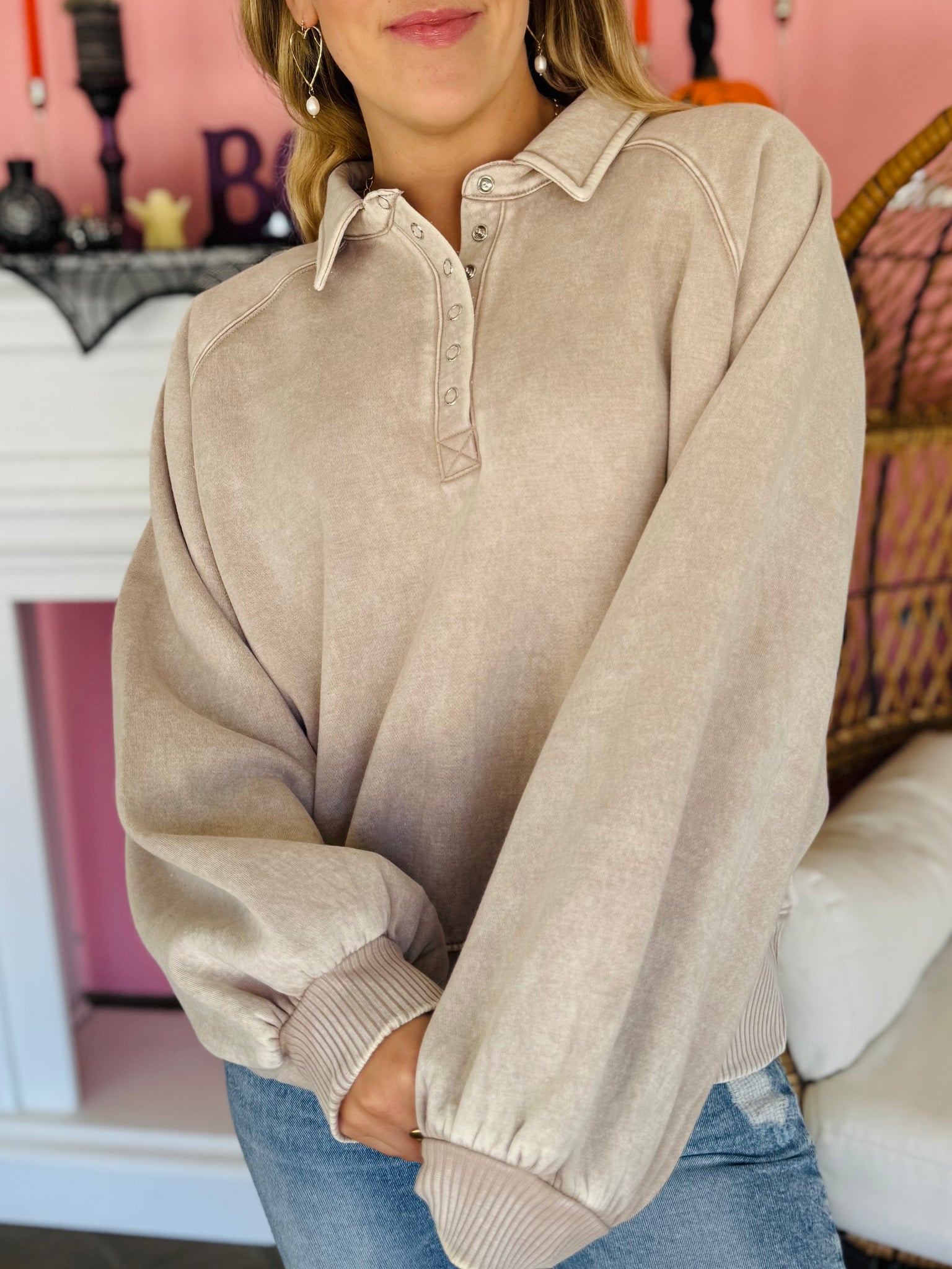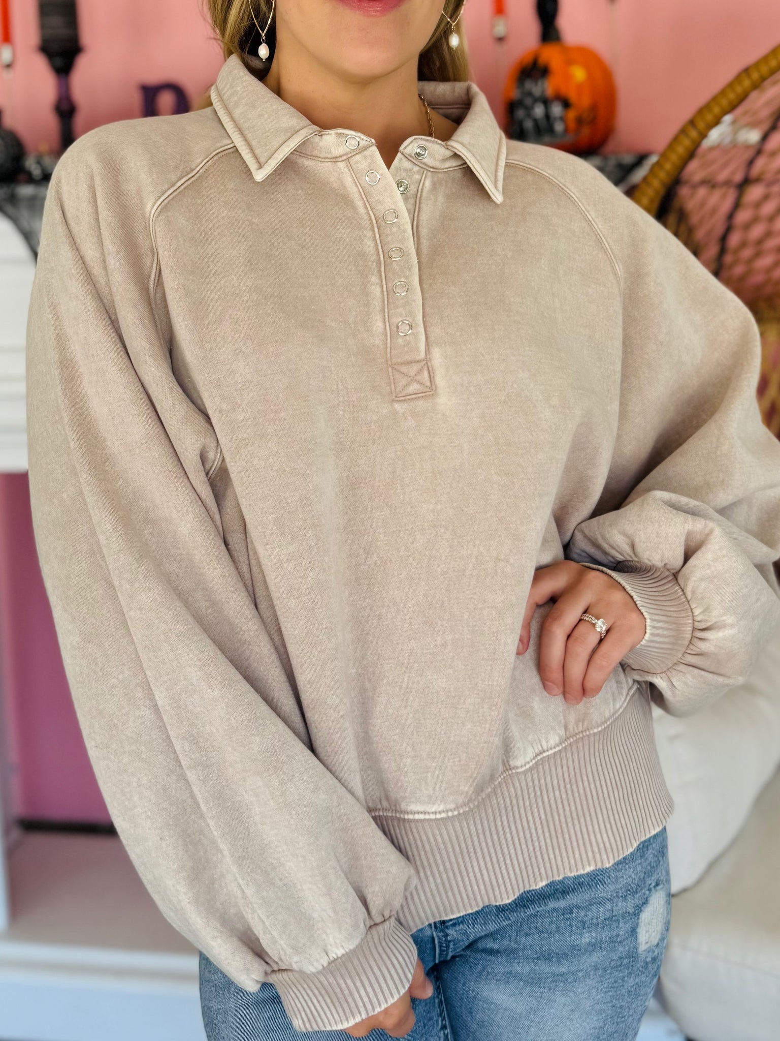 We are loving this super cozy quarter button pullover! It's an ash mocha color and is so comfortable you will be living in it this fall. It has a cute collar with front snap buttons. It is stretchy and runs slightly oversized.