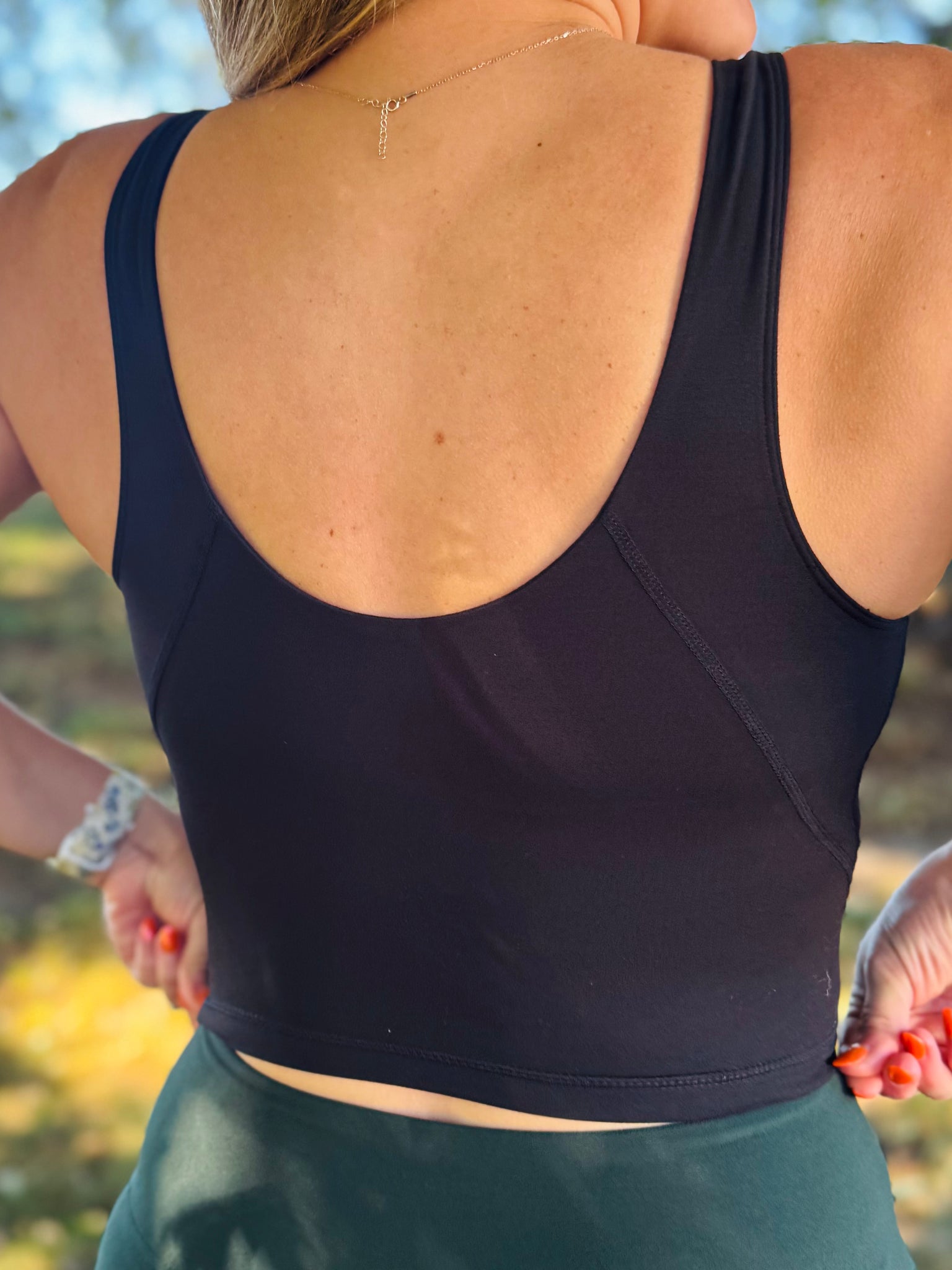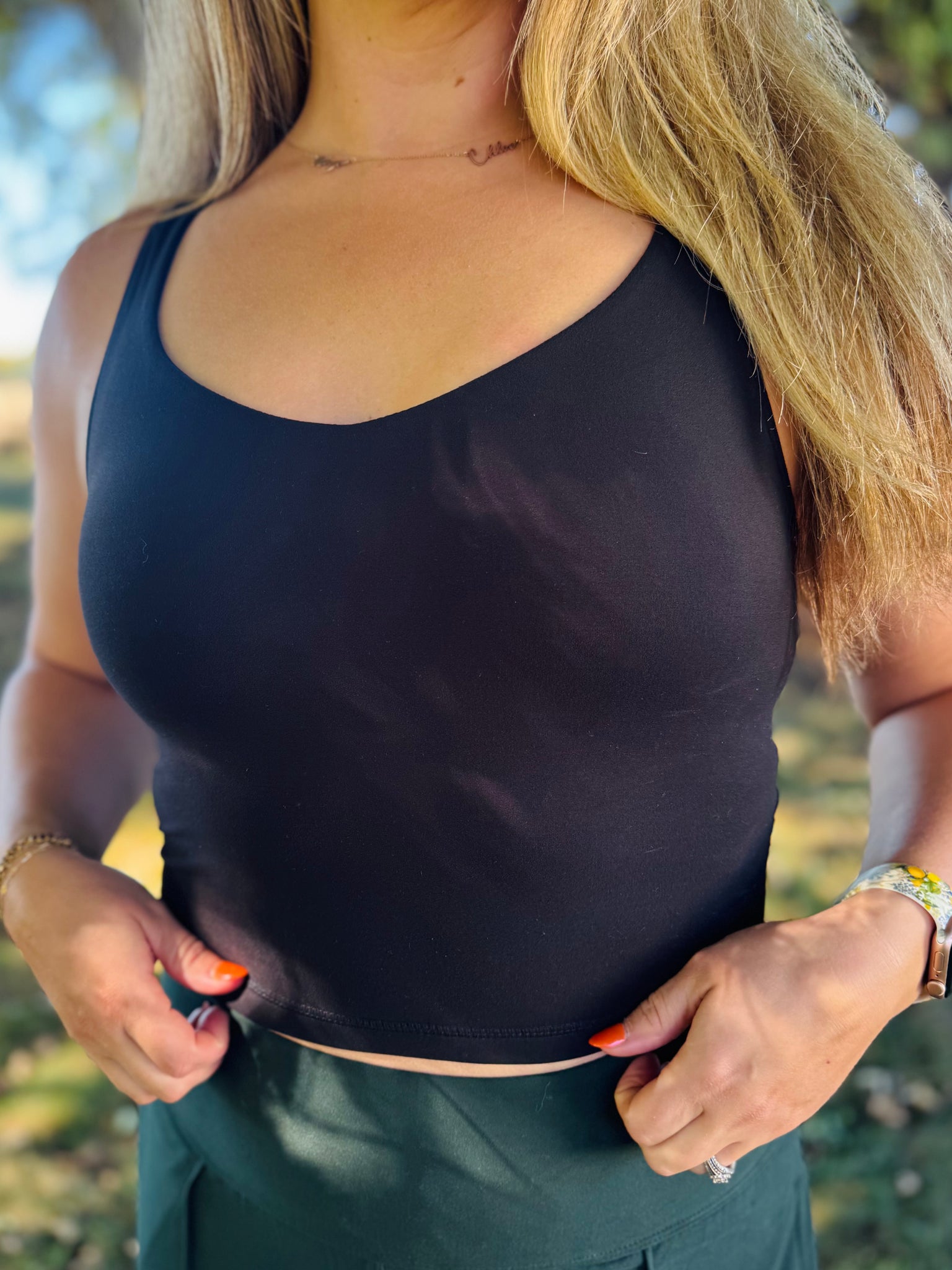 We are loving this black stretchy athletic tank top! It fits true to size and is a cropped style. Has removable bra padding and is a butter soft material.