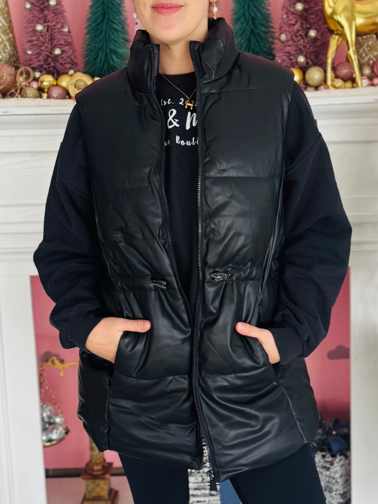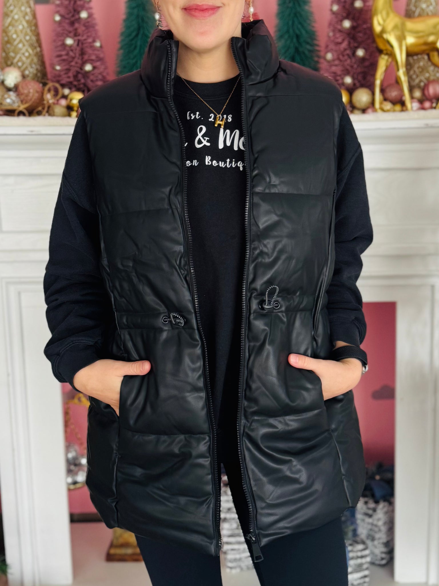 This sleek and modern layering piece for winter has been a hit! It’s a longer style black puffer vest made with faux leather and has front pockets. It has a collar and zip up front with a drawstring waist, creating a flattering shape. Vest runs true to size.