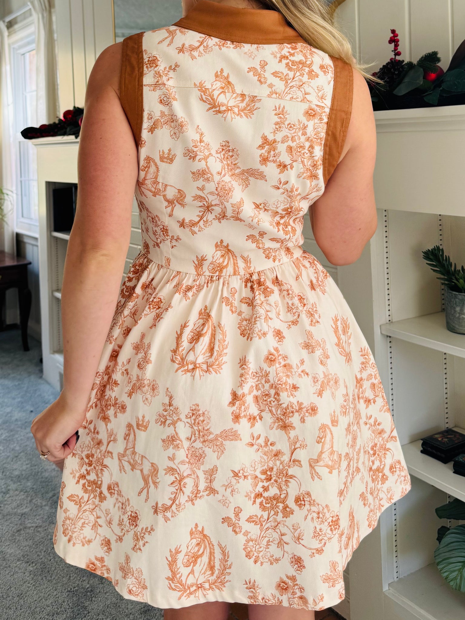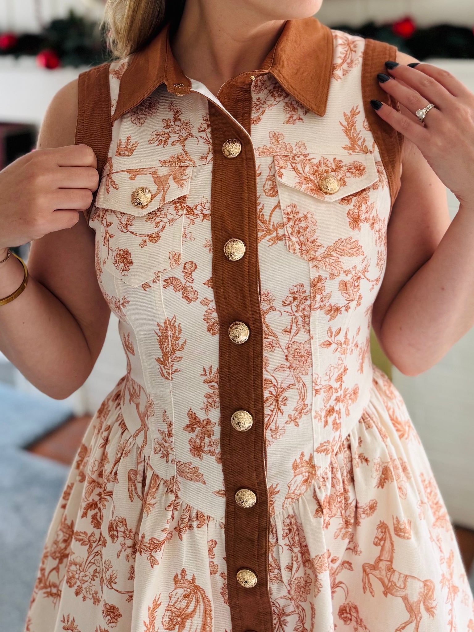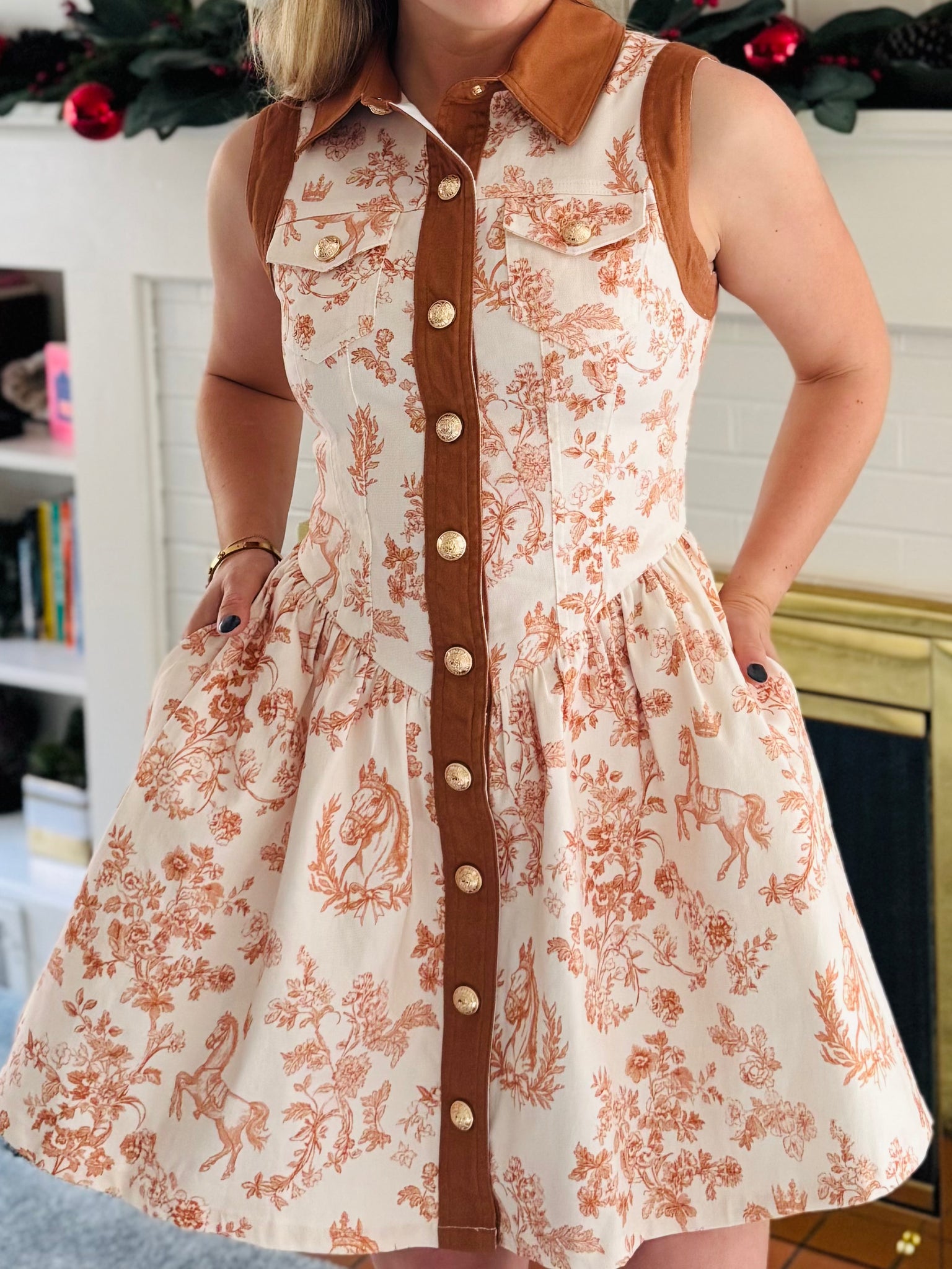 Our favorite dress is here in this brand-new adorable camel toile print! This stretchy denim dress is collared and has adorable gold button details. The buttons are all functional snap buttons, making it easy to get on and off. Denim is stretchy and runs true to size. Bonus, it has pockets!