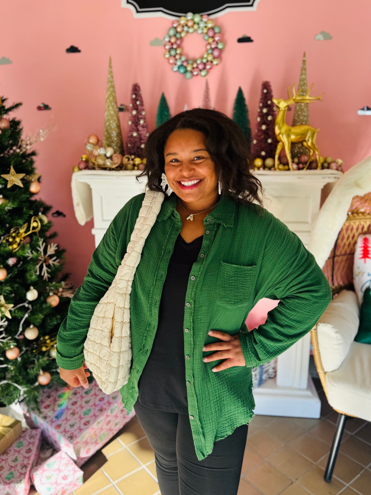 These lightweight, button up tops are the absolute best to throw over a tee or tank all year round! This adorable darker green color is the cutest for the holiday season. Top runs slightly oversized.