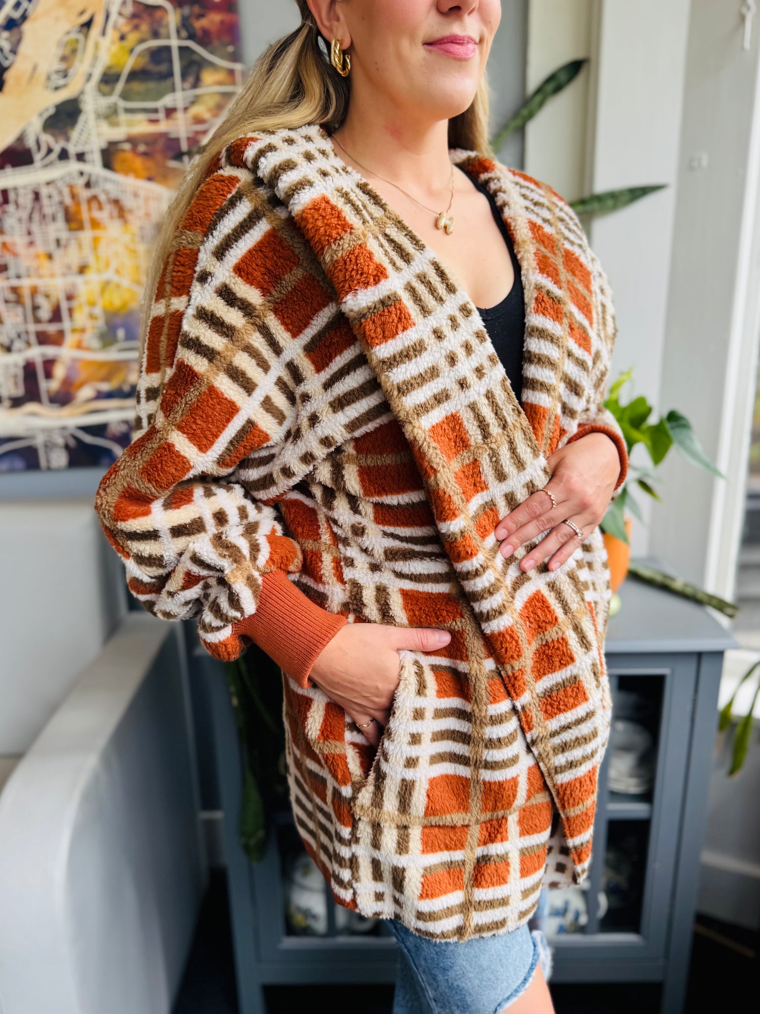 Fall Rust Plaid Fluffy Cardigan