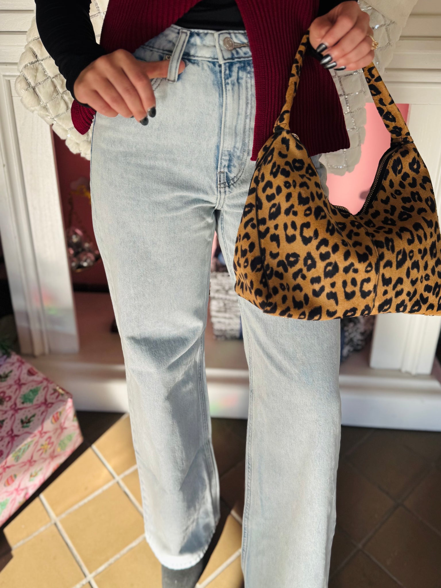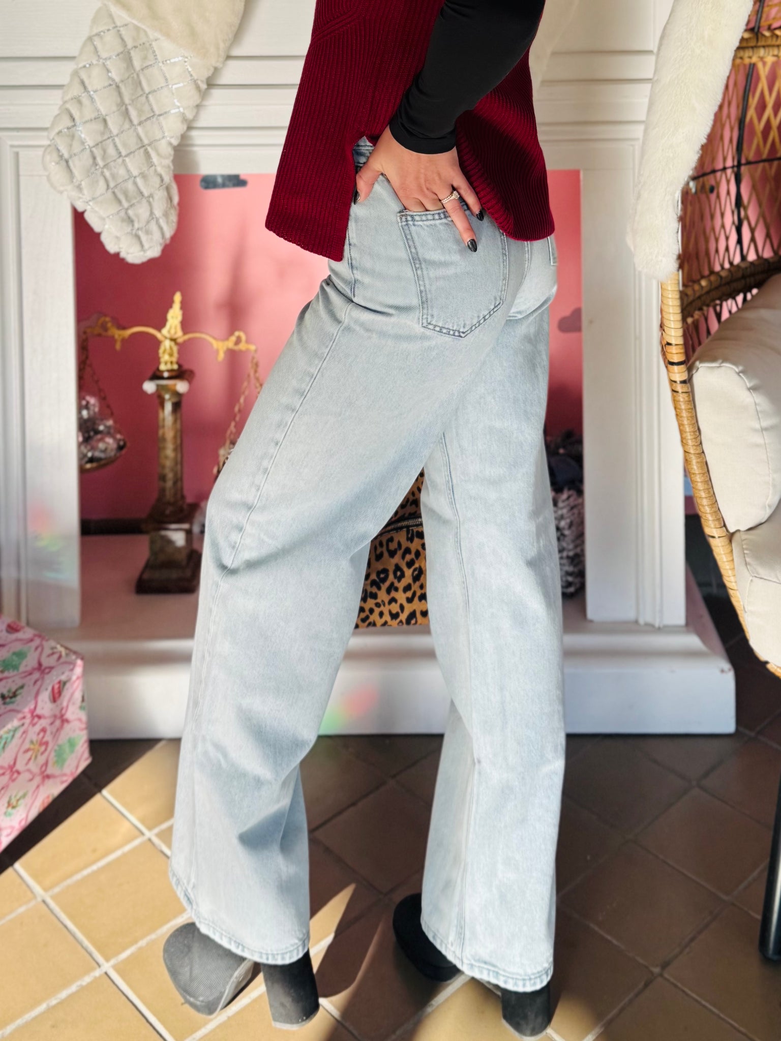 We are loving these light wash denim jeans! They are high waisted and are a wide leg style. They are flattering and can be easily dressed up or down. Jeans run true to size.