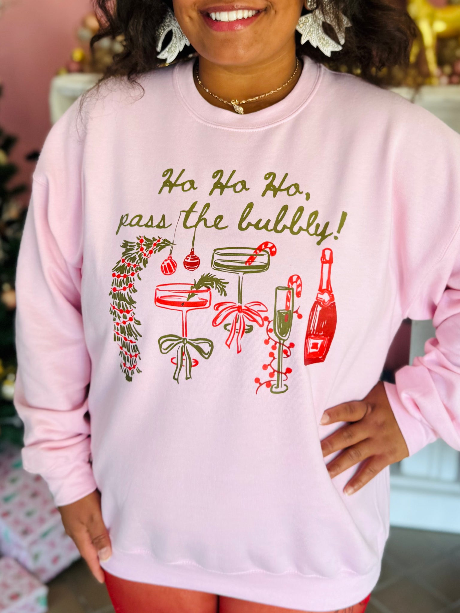 The most festive pink crewneck for the holidays! This Christmas cocktail print is the absolute cutest and reads "Ho, ho, ho, pass the bubbly". Crewneck runs slightly oversized.